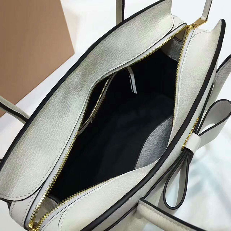 - Tubular handles with cotton cord inside, joined by a leather strap with covered button