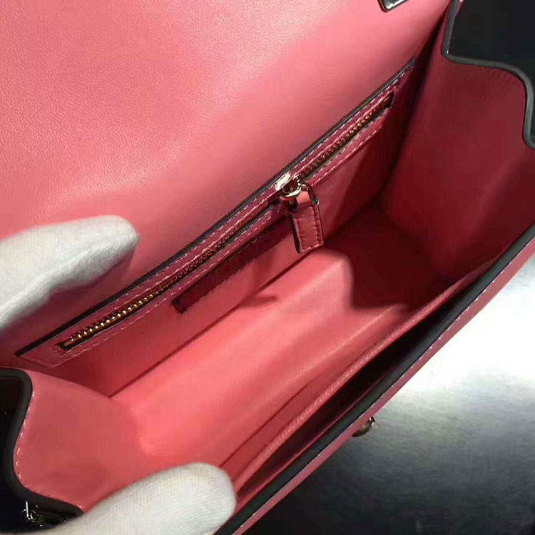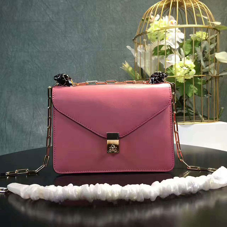 - The handbag is embellished with two panther heads in brass and enamel, through which the chain slides and can be adjusted.