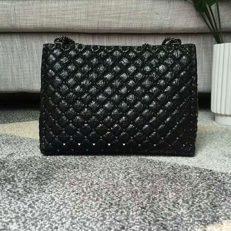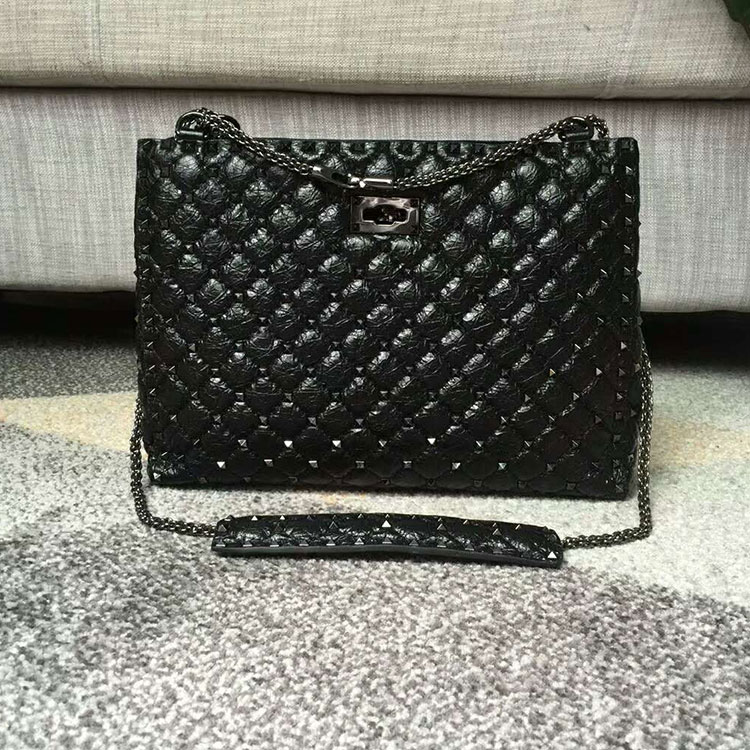 Valentino Garavani Rockstud Spike tote bag in soft crackle lambskin leather. Quilted bag with micro stud detailing. The adjustable chain means the bag can be worn as a shoulder bag or as a cross body bag.