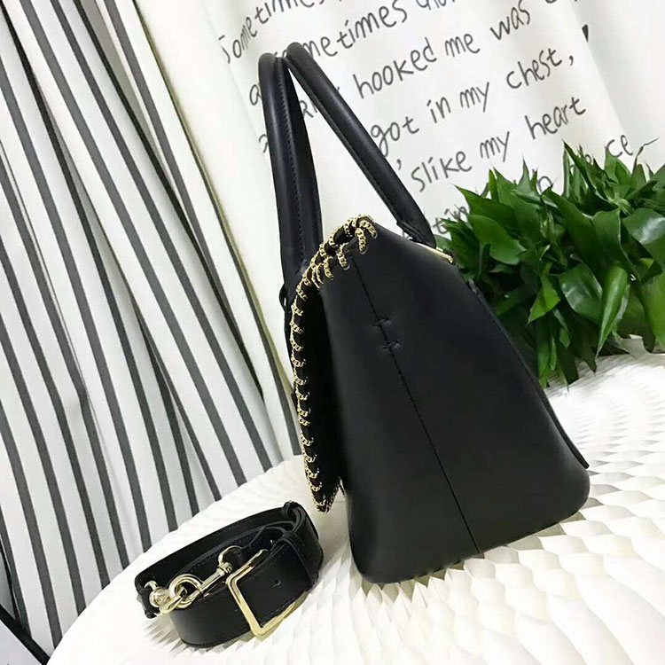- Flip lock closure decorated by two maxi studs tied by a small decorative chain