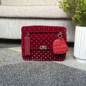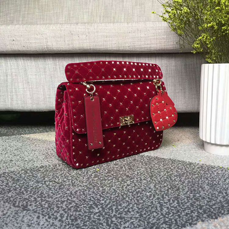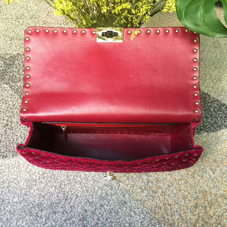 Valentino Garavani Rockstud Spike medium chain bag in velvet. Quilted bag with micro stud detailing. The detachable top handle and the adjustable, detachable chain strap mean the bag can be worn as a shoulder bag, a cross body bag, or carried by hand.