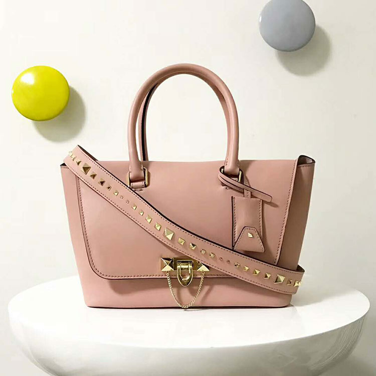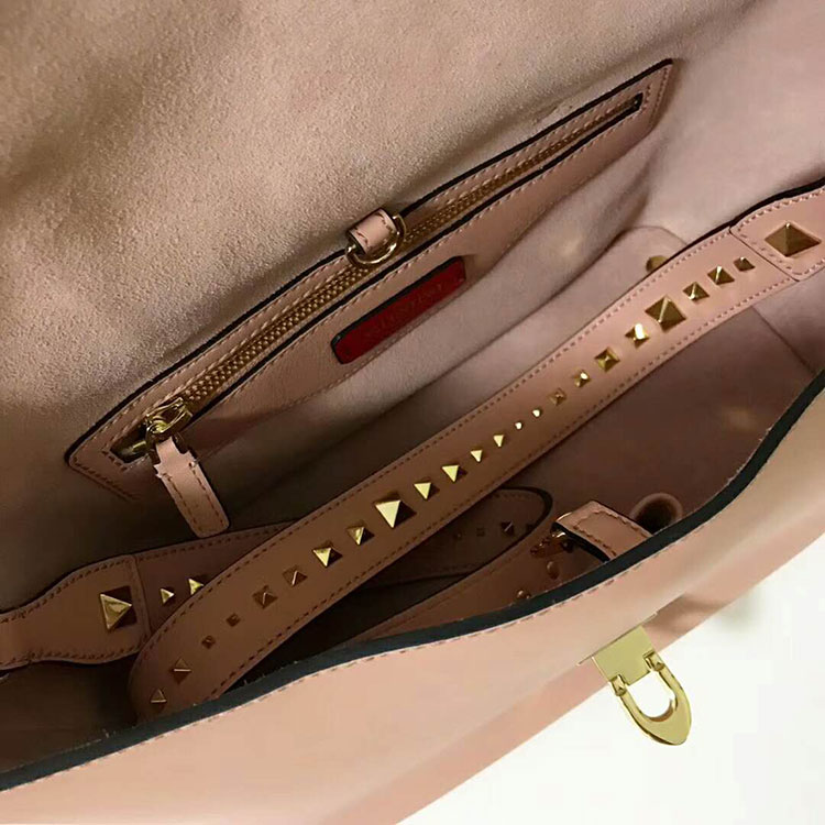 The new Valentino Garavani Demilune is an example of fine leather craftsmanship combining a smooth and elegant design with new and exclusive detailing. Double handle bag in soft full grain calfskin leather with a natural hand and shiny finishing. Tubular handles. The strap, adorned with studs in different sizes, is adjustable and removable.