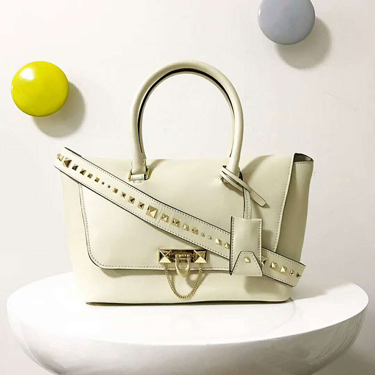 The new Valentino Garavani Demilune is an example of fine leather craftsmanship combining a smooth and elegant design with new and exclusive detailing. Double handle bag in soft full grain calfskin leather with a natural hand and shiny finishing. Tubular handles. The strap, adorned with studs in different sizes, is adjustable and removable.