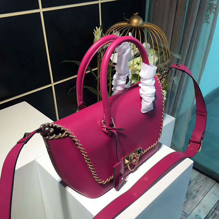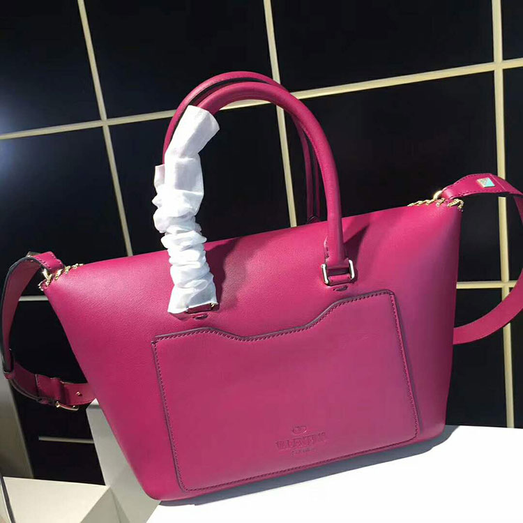 The new Valentino Garavani Demilune is an example of fine leather craftsmanship combining a smooth and elegant design with new and exclusive detailing. Double handle bag in soft full grain calfskin leather with a natural hand and shiny finishing. Tubular handles. The strap, adorned with studs in different sizes, is adjustable and removable.