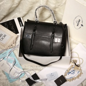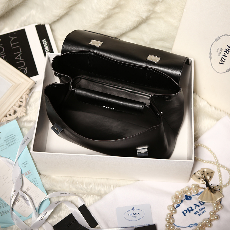 2014 Prada Lux Double Satchel Bag 348905 in Black Original Calfskin Leather