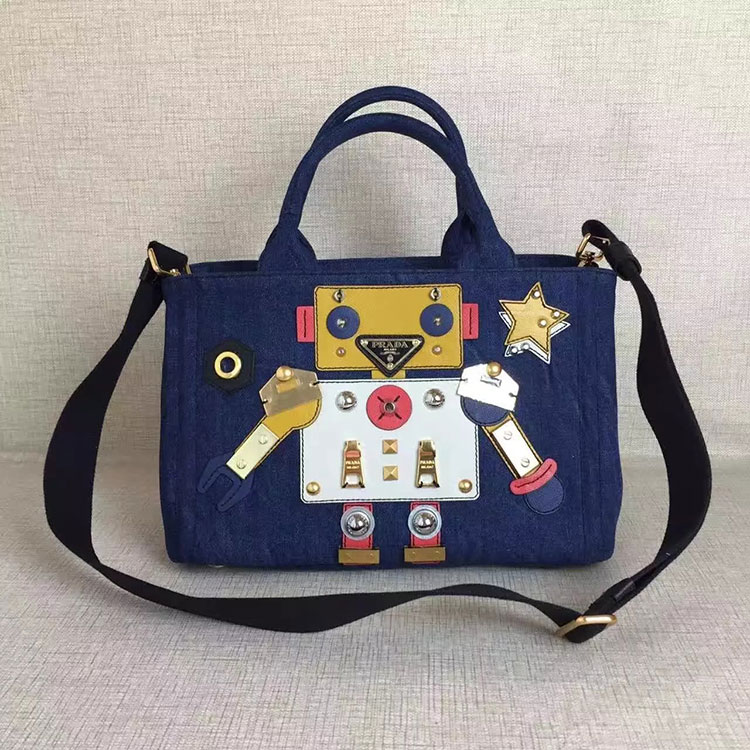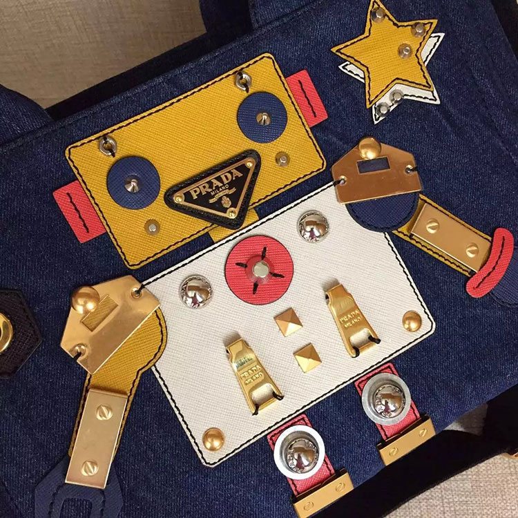 - Denim bag with Robot motif leather and metal appliques