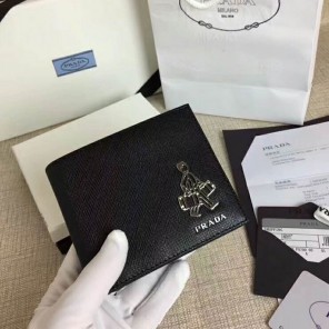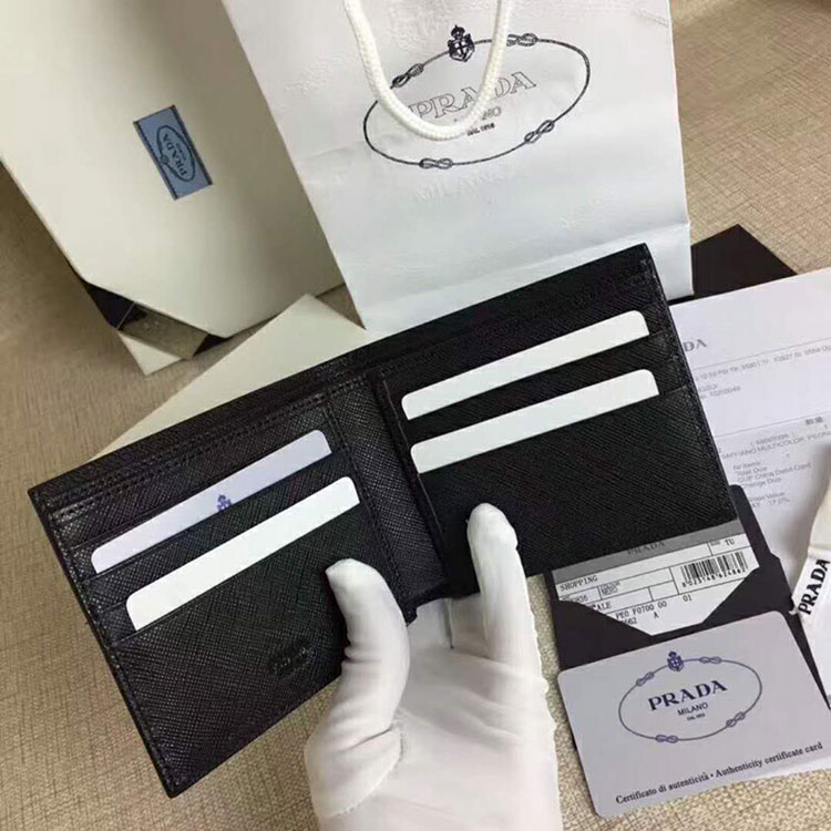 Prada Men leather wallet Come with serial numbers, Prada authenticity card, Prada dust bag, Prada Box and Prada care booklet.