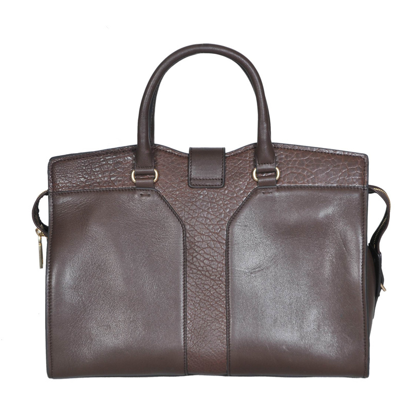 This leather bag has a stitched Y detail either side, a zipped top fastening and single gold-metal Y button fastening. The bag has two top handles with one zipped and two open internal pockets. Leather, fabric lining.