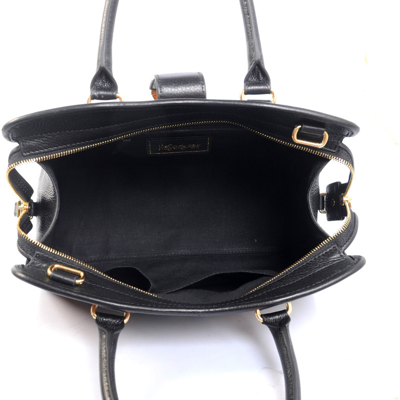 This leather bag has a stitched Y detail either side, a zipped top fastening and single gold-metal Y button fastening. The bag has two top handles with one zipped and two open internal pockets. Leather, fabric lining.