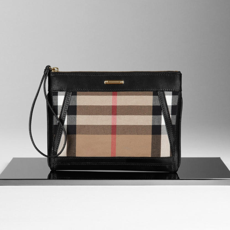 - House check cotton twill wristlet with bridle leather trim