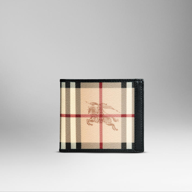 - Haymarket check coated canvas folding wallet- Smooth leather trim- Note and card slots- 100% PVC with leather trim