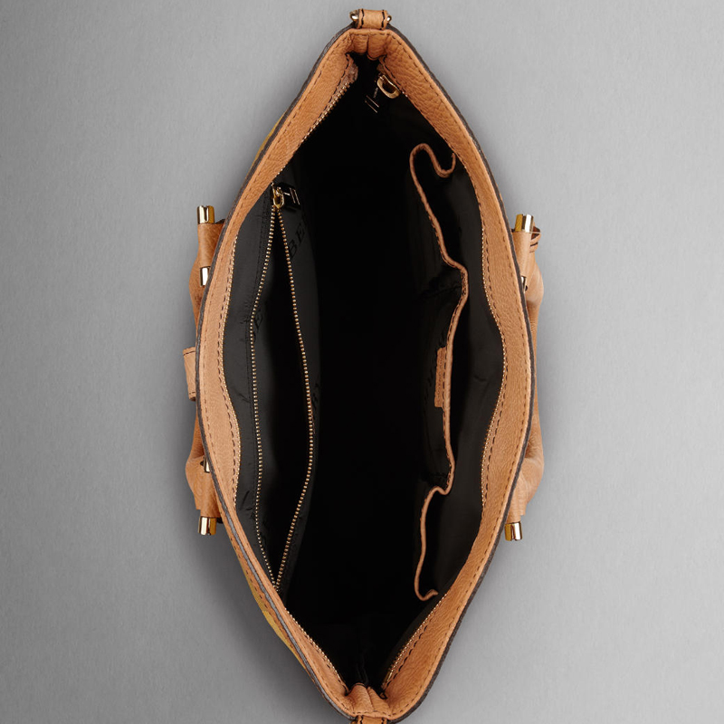 - Two rolled leather handles, flat detachable leather shoulder strap, leather luggage tag