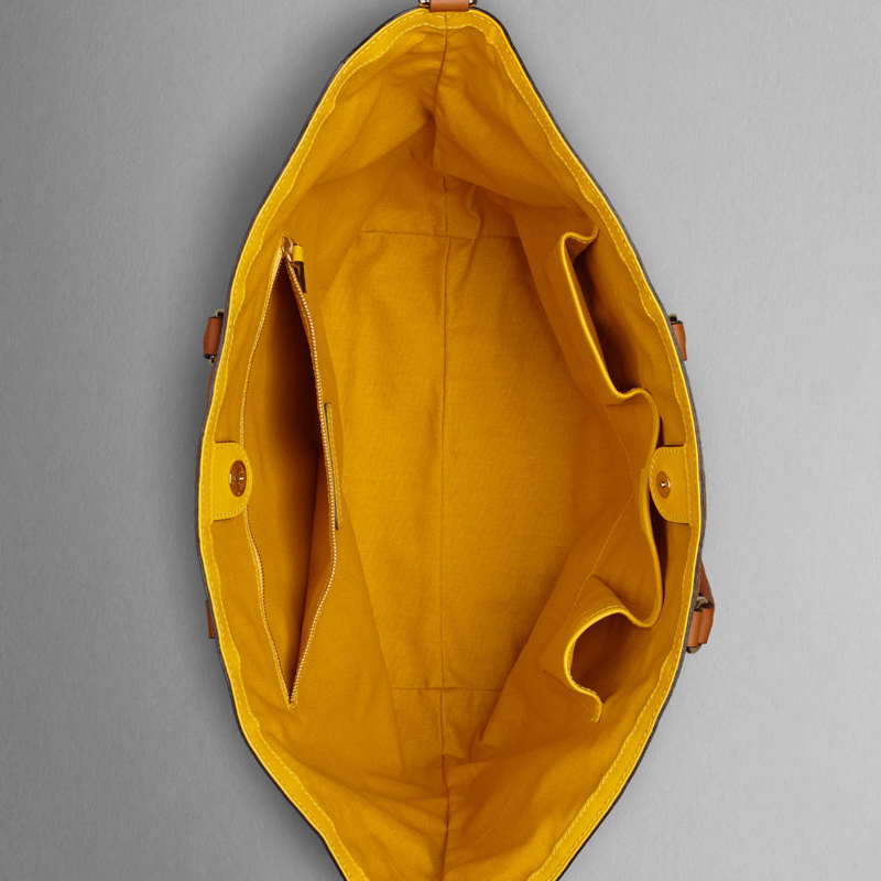 - Top zip closure, two rolled leather handles, contrast colour calf-leather panels