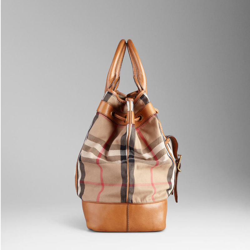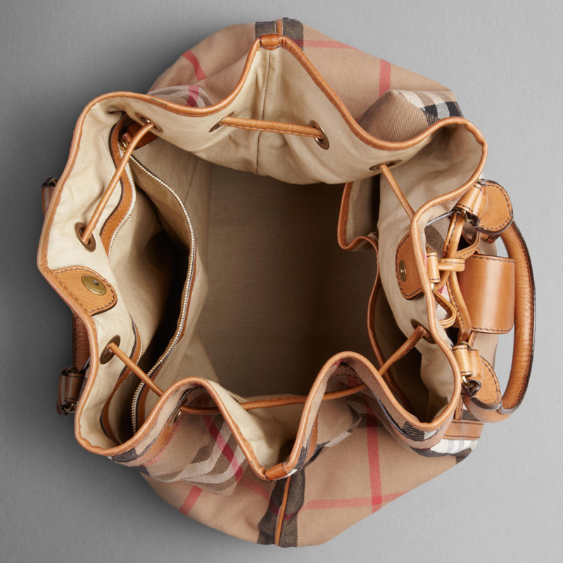 - Open top with magnetic snap-button closure, drawstring leather fastening