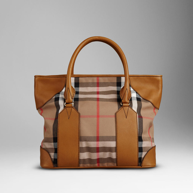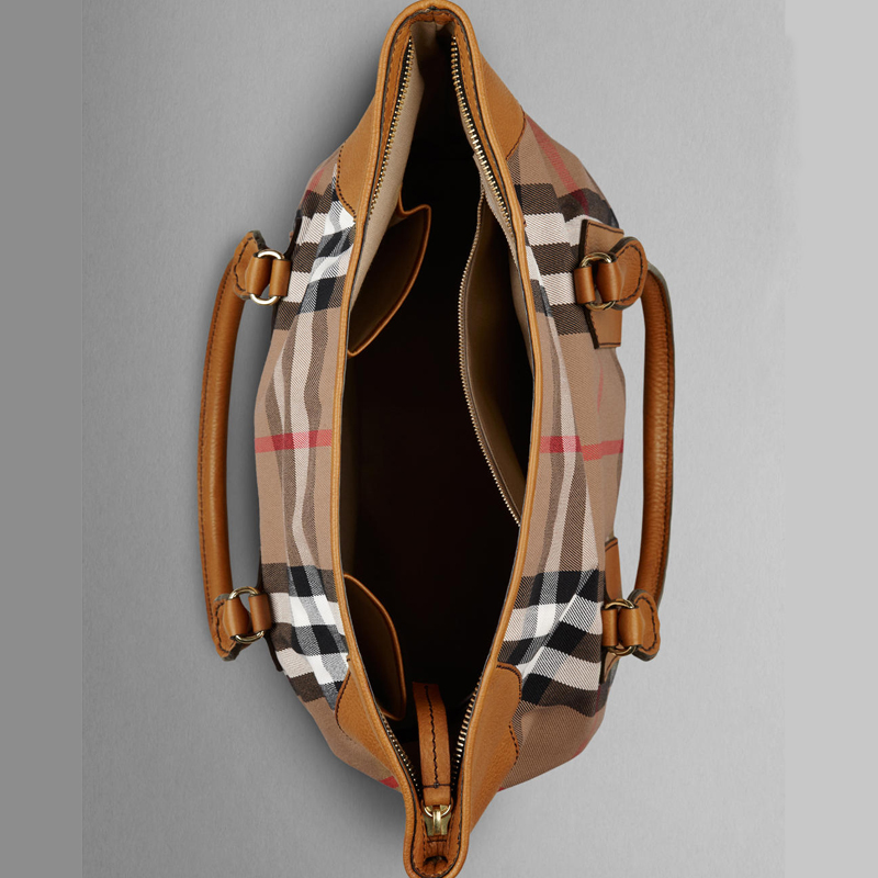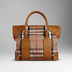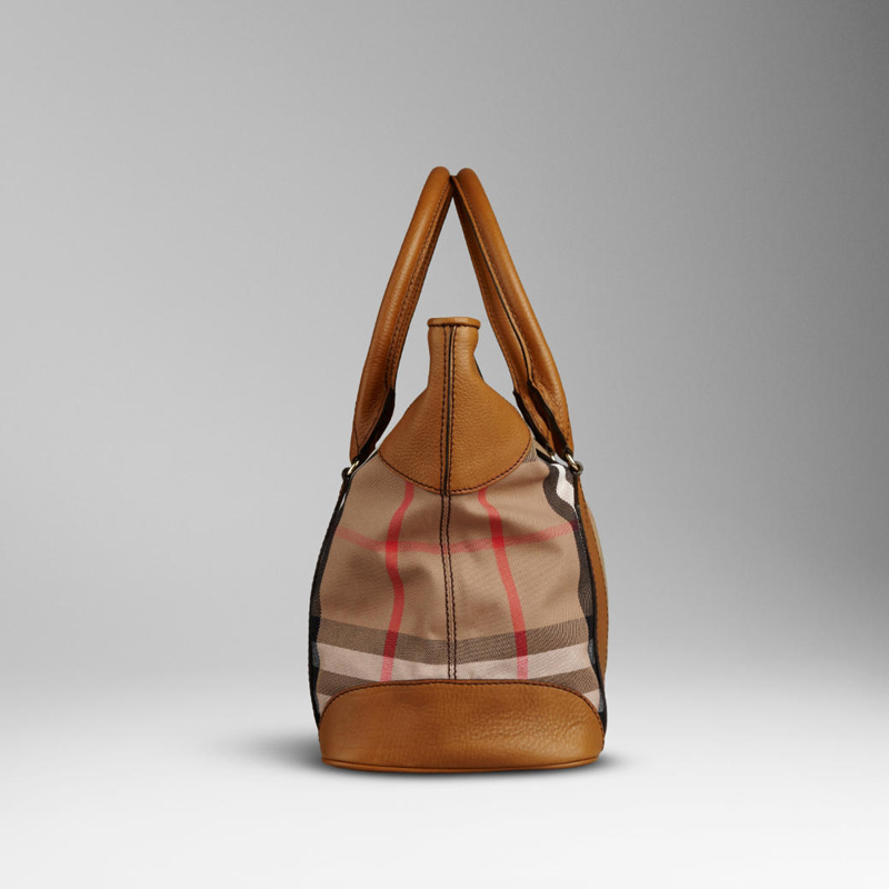 House check cotton tote bag with protective leather panels