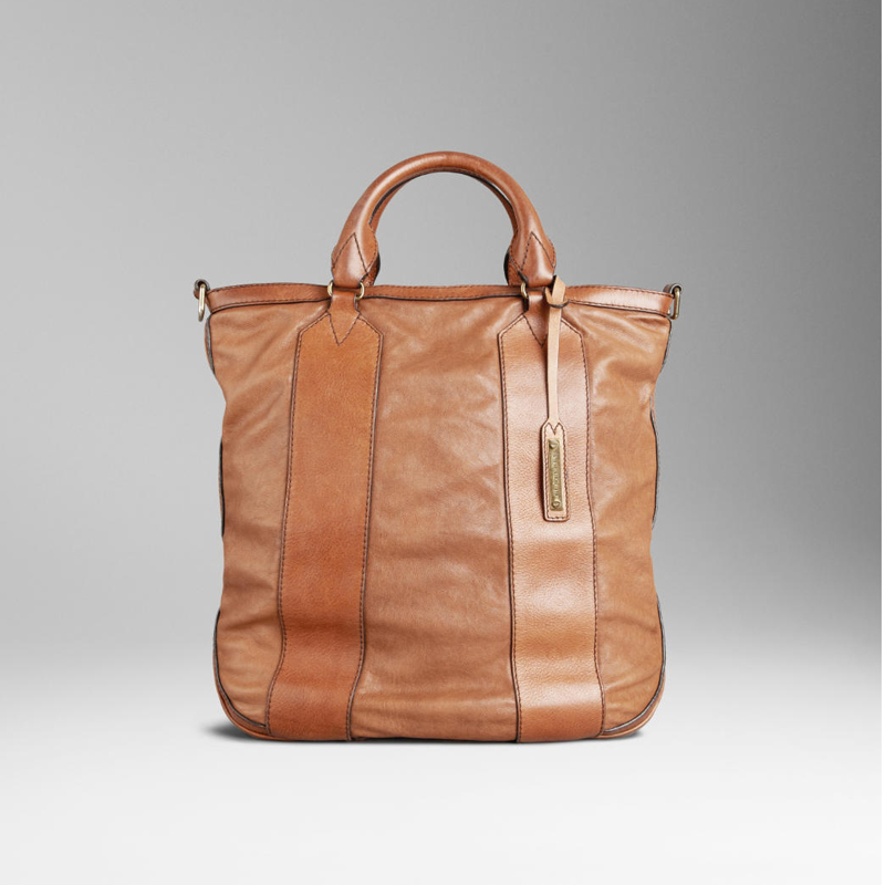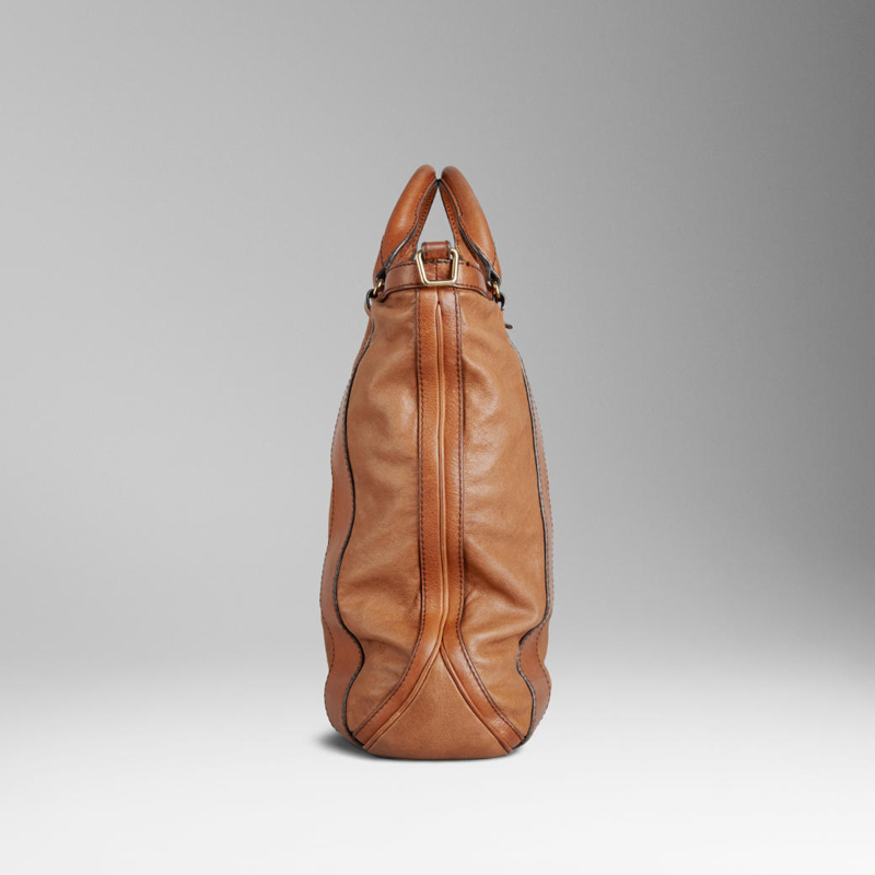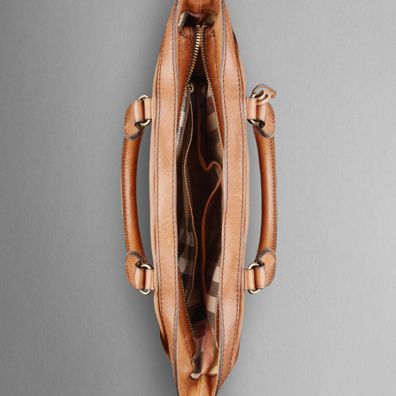 - Top zip closure, two rolled leather handles, detachable flat leather shoulder strap with vintage-finish metal attachments