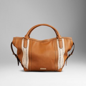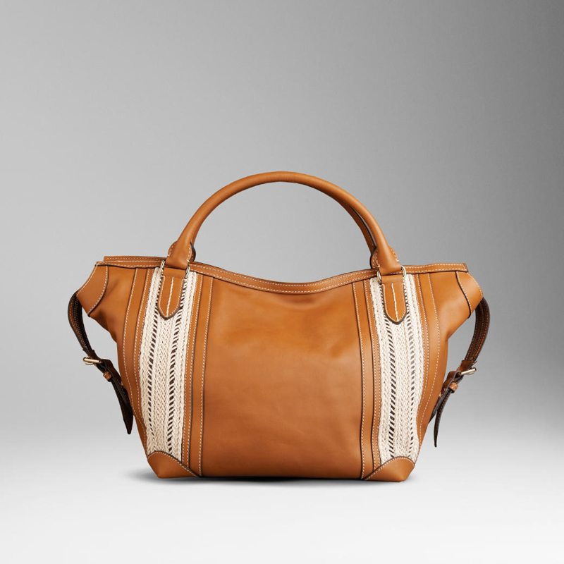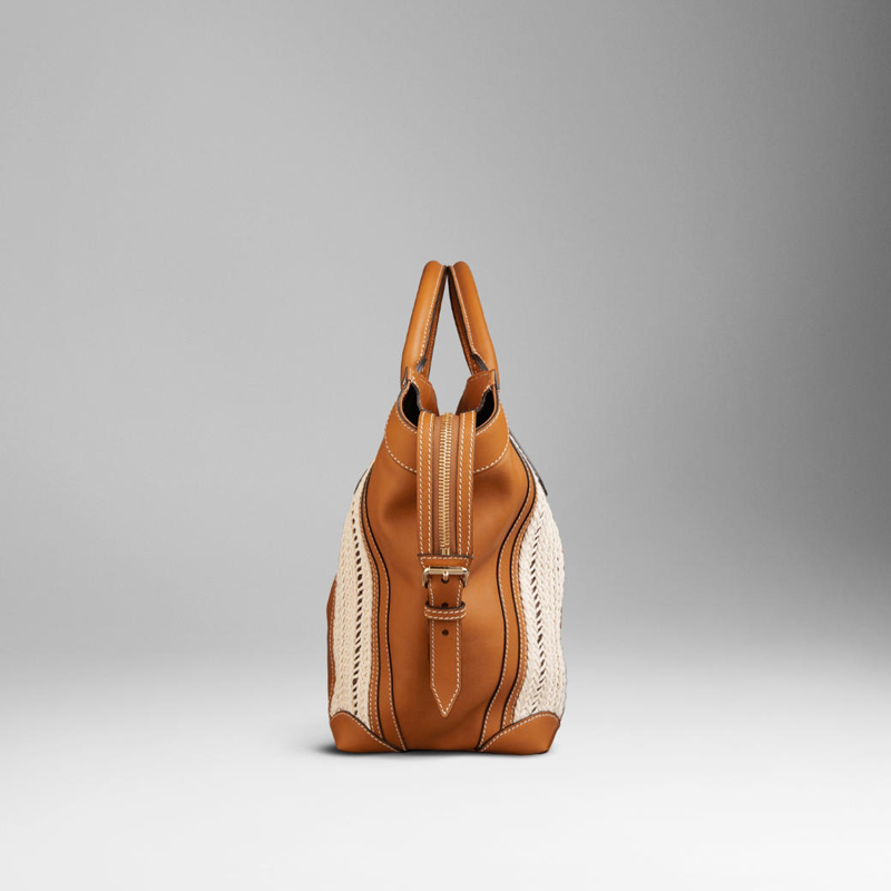- Secure top zip closure with leather zip pull, belt fastenings at the side, two rolled leather handles