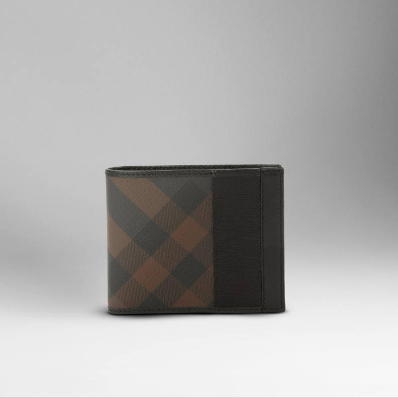 - Smoked check coated canvas folding wallet- Smooth leather and webbed trim- Note and card slots- 100% PVC with leather trim