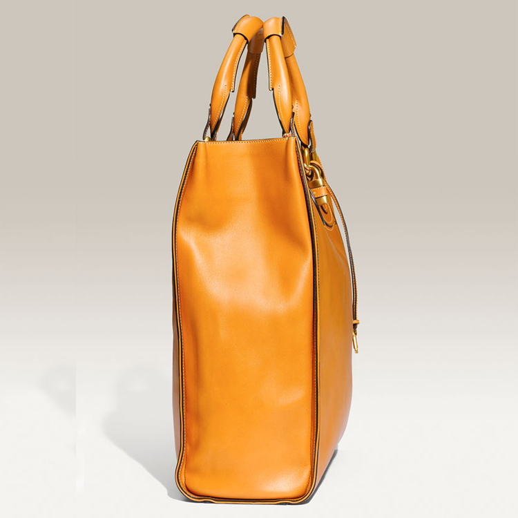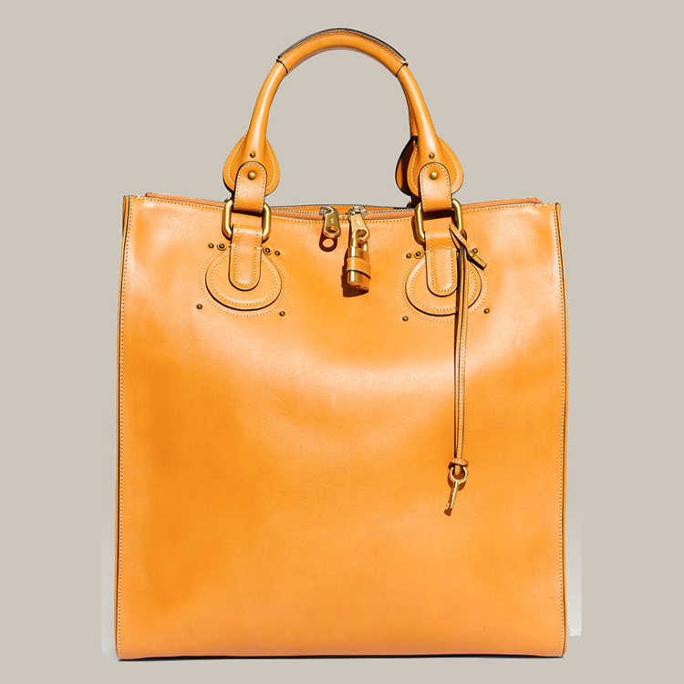 Substantial signature padlock hangs from the two-way top zip closure of a double-handled tote cut from smooth, supple leather.