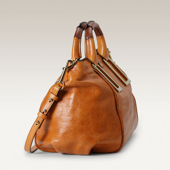 Rich, glazed leather distinguishes a slouchy top handle satchel detailed with sophisticated gold tone hardware and topped with rolled bi-color handles. An optional cross body strap provides a convenient carrying option.