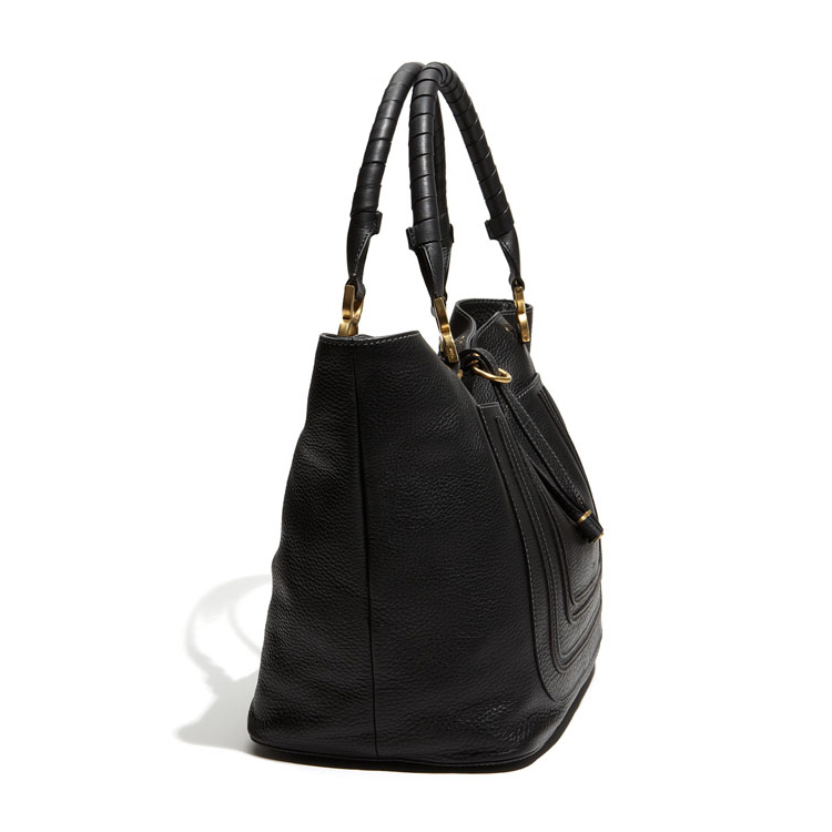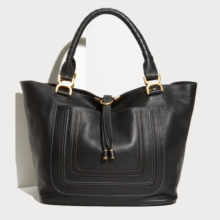 Subtle embossing embellishes the front pocket of a sophisticated tote crafted from lightly pebbled leather and topped with wrapped handles.