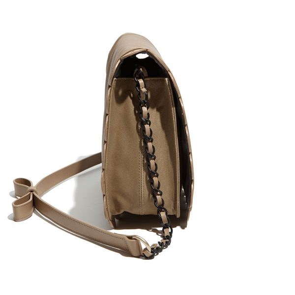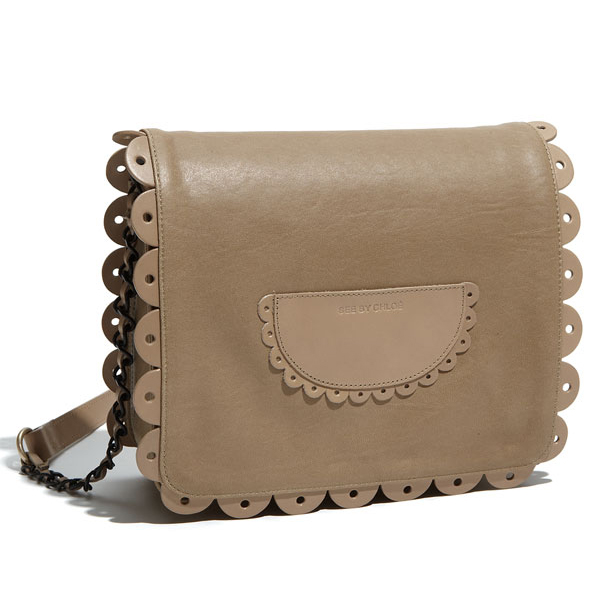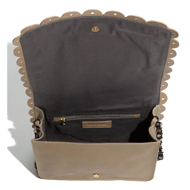Scalloped trim playfully revises a lightly textured leather crossbody bag fashioned with a front flap closure. A prim bow tops the chain-and-leather strap for a soft look with edgy undertones.