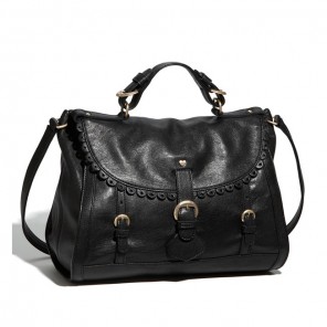 A scalloped trim stenciled with circle cutouts details the curved flap on a lustrous leather satchel. Burnished logo-etched buckles secure the top handle, while a thin crossbody strap completes a delightfully vintage look.