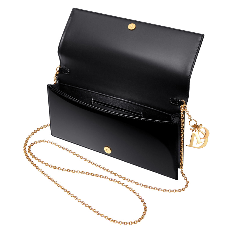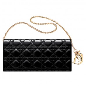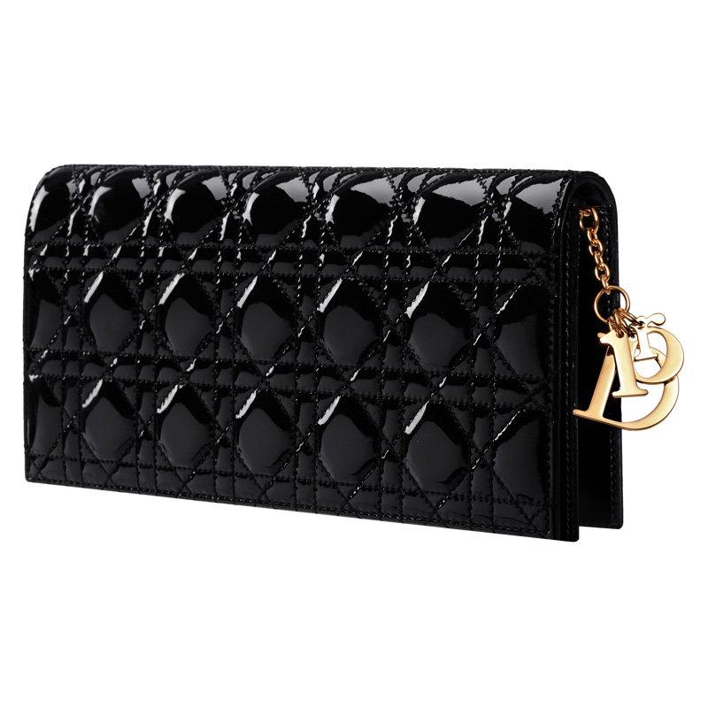 This timeless, elegant pouch in black quilted patent leather features characteristic "Cannage" stitching, an architectural Dior signature. Its silver-tone chain wrist loop with a handbag charm allows it to be worn on the wrist.
