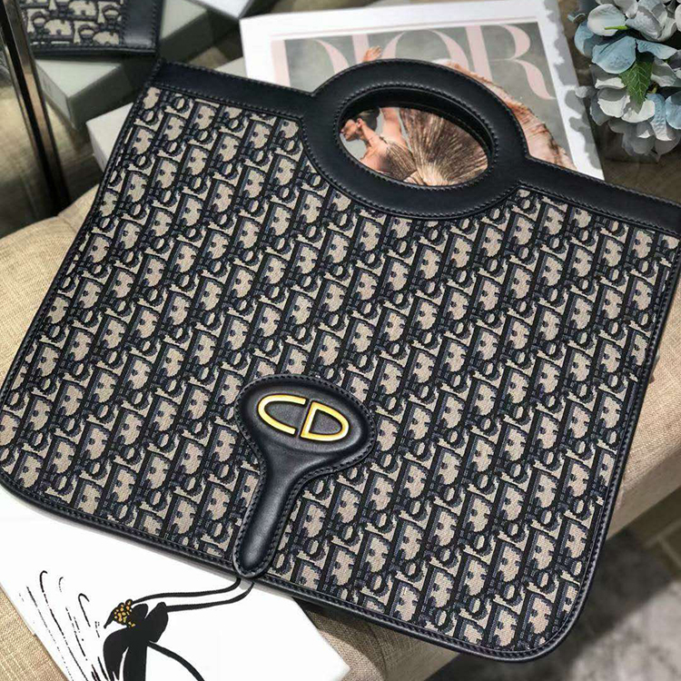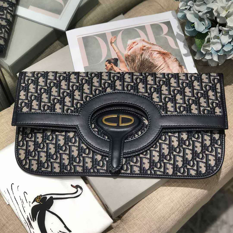 The Dior Oblique clutch portrays emblematic details that offer timeless appeal. The piece is crafted in original Dior Oblique jacquard canvas and adorned with a gold-finish 'CD' signature on the front. It may be held by its tonal leather handle or folded and used a clutch for a day or evening look.