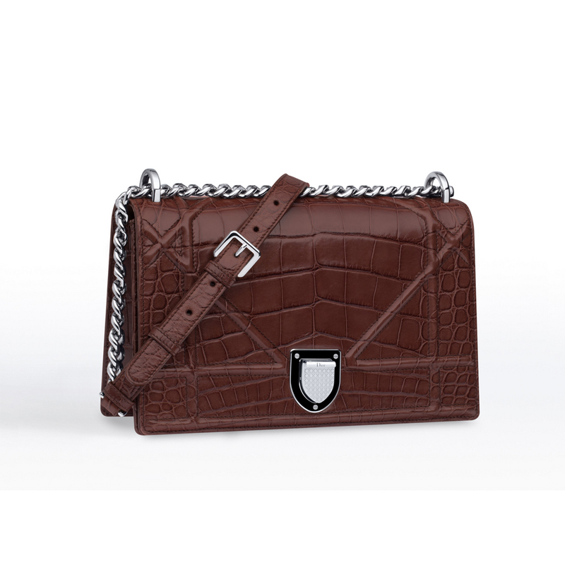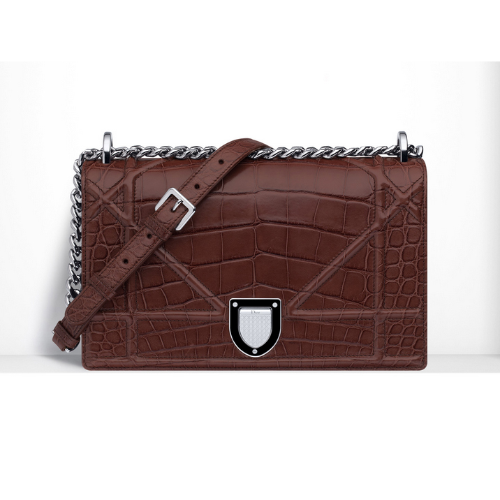 Fashionable and architectural, "Diorama" is the bag of the Spring-Summer 2015 show. Magnificent and luxurious, this flap bag in glossy Noisette crocodile is adorned with a graphic oversized "Cannage" motif. Its crest-shaped clasp in silver-tone metal edged with black enamel is the distinctive mark of the new Dior woman.
