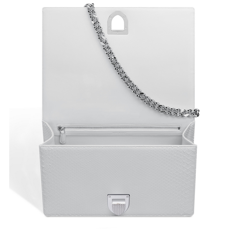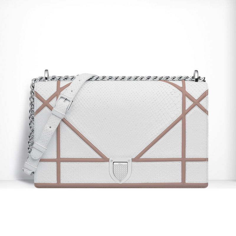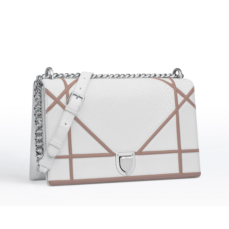 Fashionable and architectural, "Diorama" is the bag of the Spring-Summer 2015 show. This large flap bag in glossy white python is adorned with an oversized graphic "Cannage" motif in Dune lambskin, inlaid with marquetry work. Its crest-shaped clasp in silver-tone metal edged with white enamel is the distinctive mark of the new Dior woman.