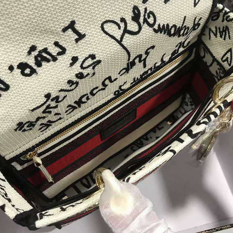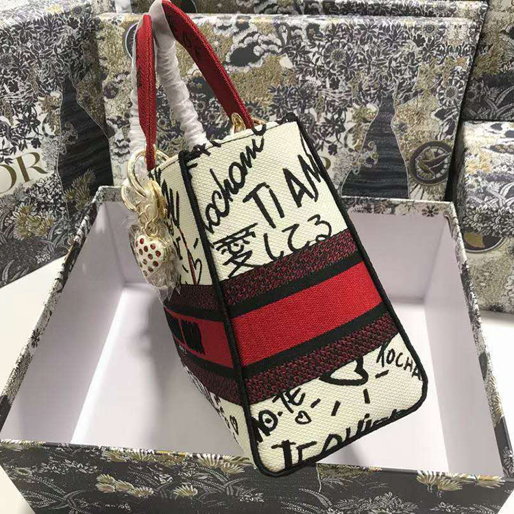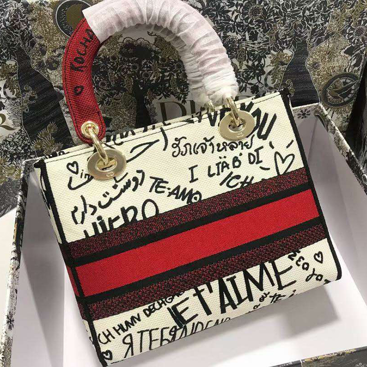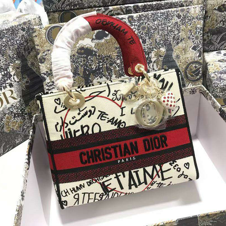 The Lady D-Lite handbag epitomizes Dior's vision of elegance and beauty. Part of the Dioramour capsule collection, this sleek and feminine latte-colored bag is fully embroidered with the Dioramour Graffiti motif, stating the words ‘I love you’ in 38 different languages. A white enamel heart charm with red polka dots joins the pale gold signature 'D. I. O. R.' charms in embellishing the classic silhouette. This medium style has a large, fully embroidered and removable shoulder strap and can be worn many ways.