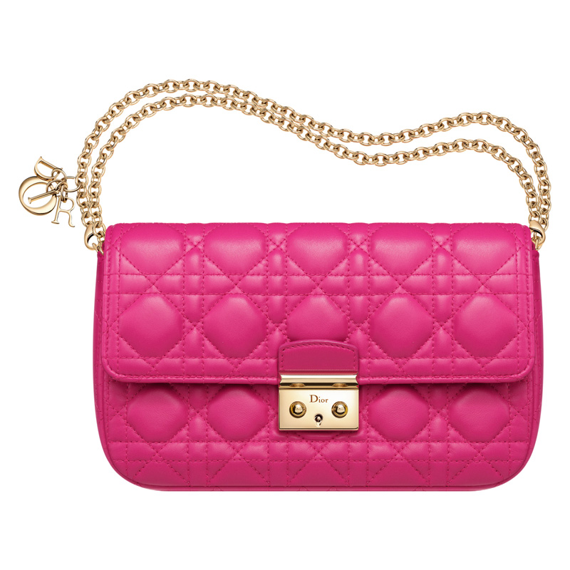 Classic with a versatile look, the 'Miss Dior' collection expresses Dior's art of refinement. This large 'Promenade' pouch in Fuchsia leather features a 'Dior' clasp adding elegance and practicality. With its removable chain, it may be worn across the body, on the shoulder or carried by hand.