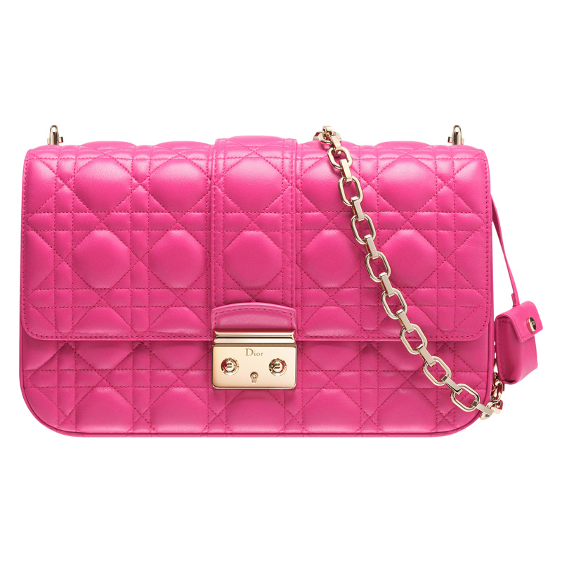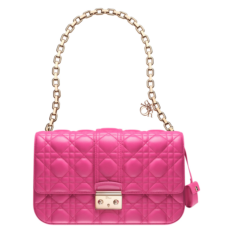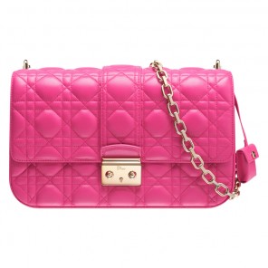 The new, iconic 'Miss Dior' collection sets itself apart with its versatile, contemporary look. In sorbet pink lambskin, the bag is accessorised with a silver-tone metal chain allowing it to be carried elegantly on the shoulder. A key in its own leather case opens the double push-button clasp.