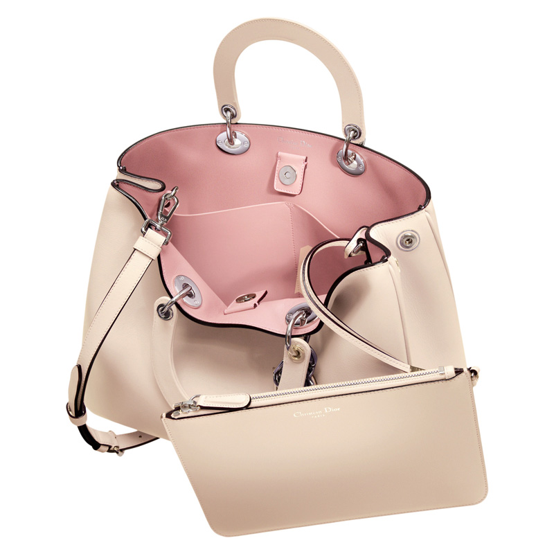 A true journey through the senses, an iconic line with timeless elegance that embodies all the craftsmanship of Dior. The exquisite leather, two handle options to carry in the hand or across the body, and the contrasting colours of the pinky beige outer and the dark pink inner make the 'Diorissimo' bag a unique model.