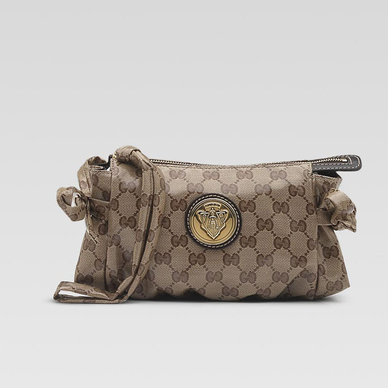 -beige/ebony crystal GG fabric with brown leather trim-gold hardware-wristlet strap-zip-top closure-inside pocket