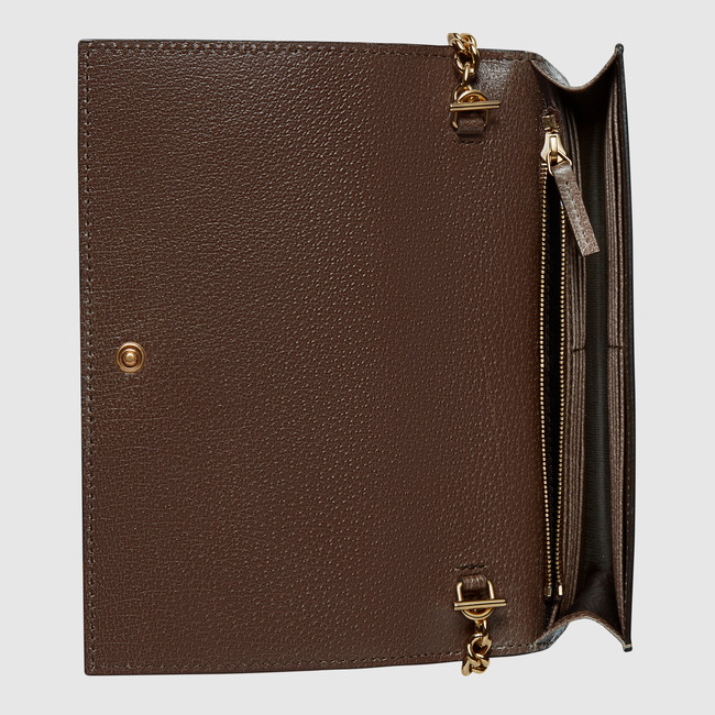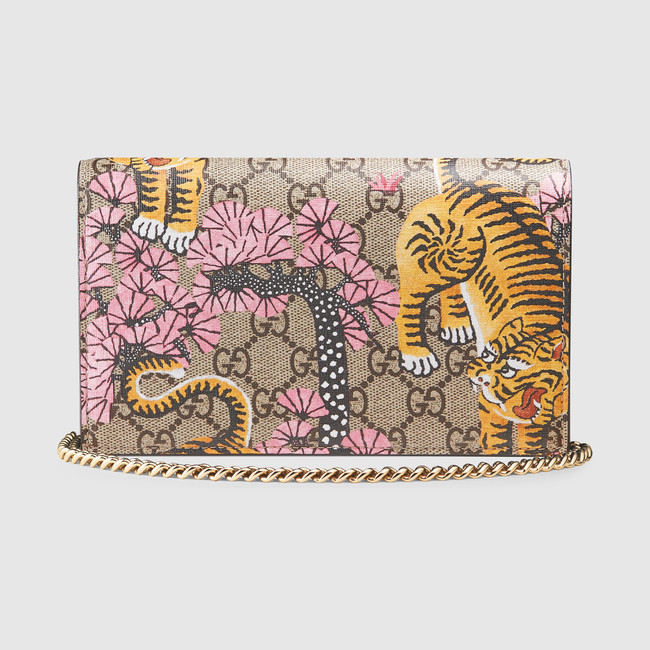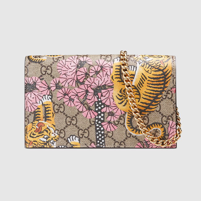 A mini chain bag that can also be used as a wallet with Gucci Bengal print on GG Supreme canvas. The print depicts tigers scattered amongst a colorful forest represented through brushstroke-style graphics to create a three-dimensional effect against the GG motif.