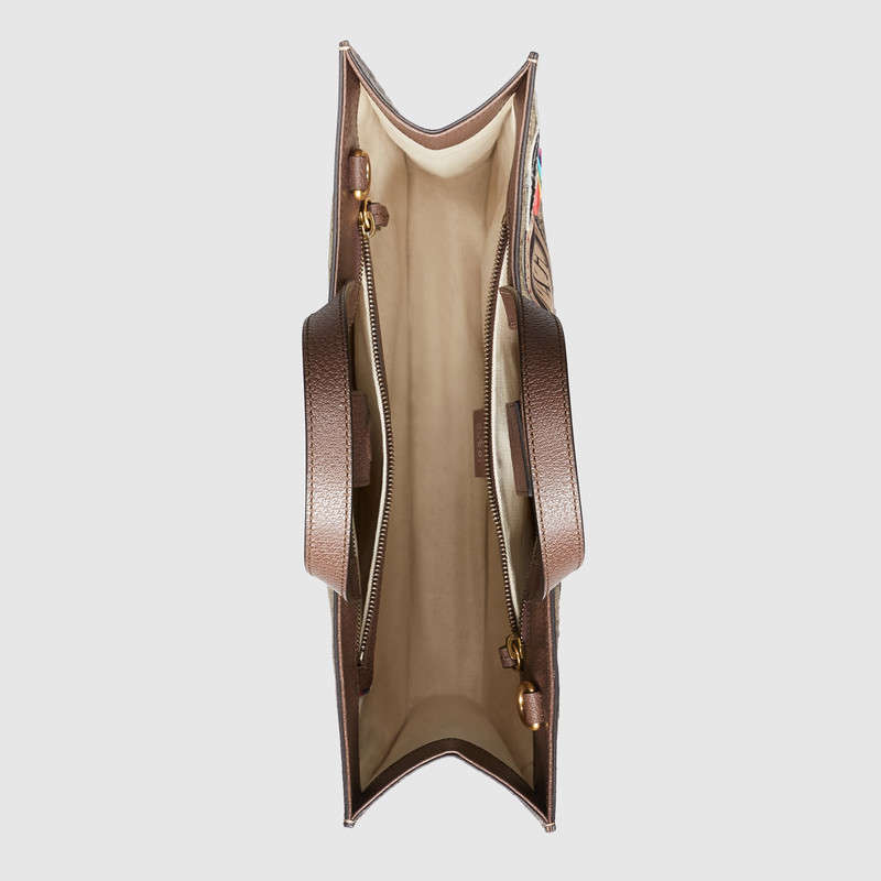 Travel continues to be a source of inspiration for Alessandro Michele. A collection of bags in the GG motif is enriched with a blend of contemporary embroideries-like the UFO-and vintage inspired details, including airmail trims and a Gucci vintage logo from the archives. The appliques are individually embroidered and then skillfully hand-applied to each piece by specialized artisans. This process ensures that no two items will be alike, giving each a one-of-a-kind appearance.