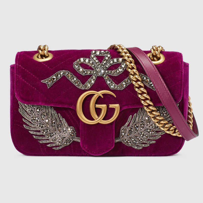 The mini GG Marmont chain shoulder bag has a softly structured shape and an oversized flap closure with Double G hardware. A feminine bow in Swarovski crystals decorates the top while feather appliques in sequins and crystals define the bottom. The sliding chain strap can be worn multiple ways, changing between a shoulder and a top handle bag. Made in embroidered chevron velvet with a heart on the back.