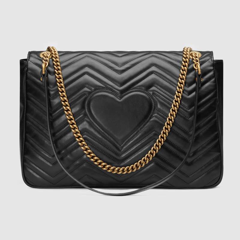The GG Marmont shoulder bag has a softly structured shape and an oversized flap closure with Double G hardware. Made in matelasse chevron leather with a heart on the back.