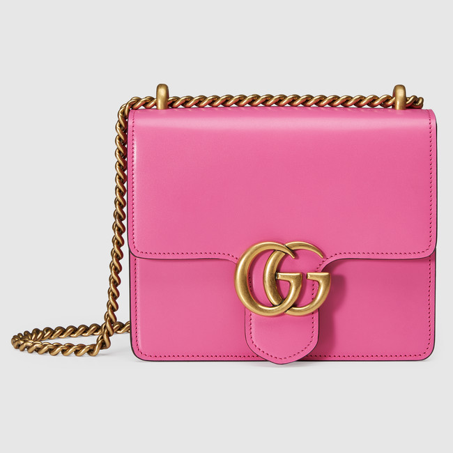 The small GG Marmont chain shoulder bag has a structured shape and oversized flap closure completed with our Double G hardware. The sliding chain strap can be worn multiple ways, changing between a shoulder and a top handle bag. Made in our shiny leather with an intense appearance, the firm compact feel of this leather is ideal for structured bags.