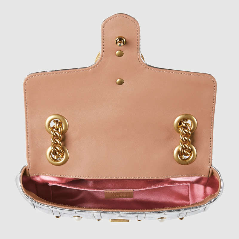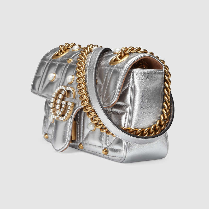 The mini GG Marmont chain shoulder bag has a softly structured shape and an oversized flap closure with Double G hardware enriched with pearls. The sliding chain strap can be worn multiple ways, changing between a shoulder and a top handle bag. Made in matelasse leather with with a cubic pattern that is further enhanced with metal and pearl studs.