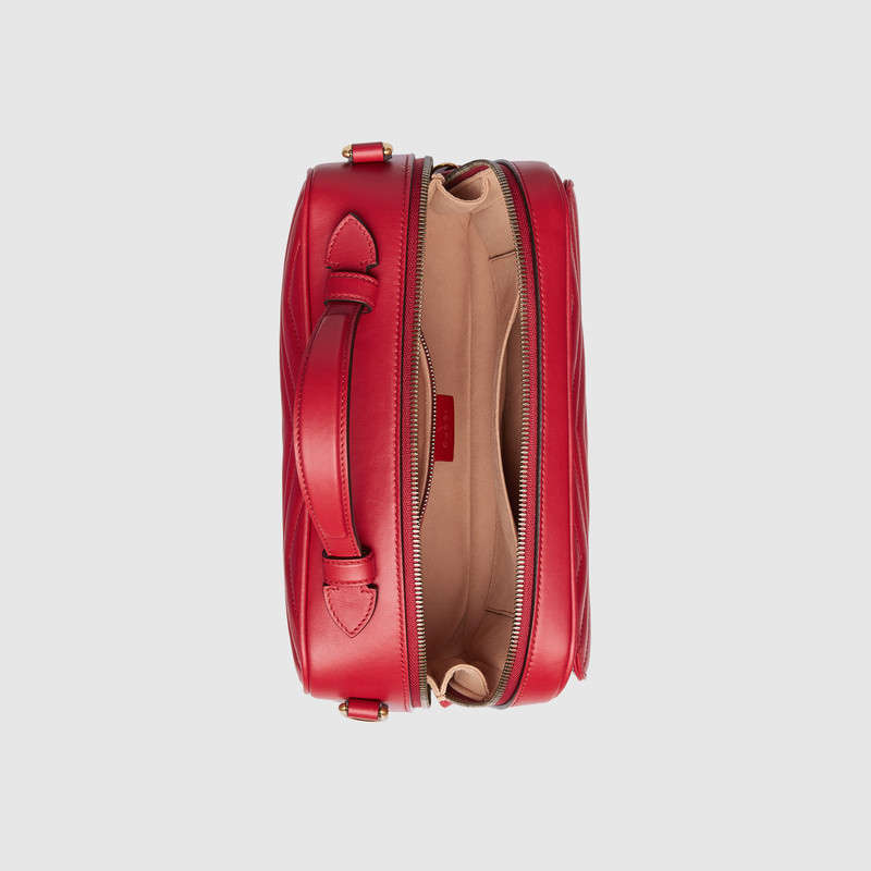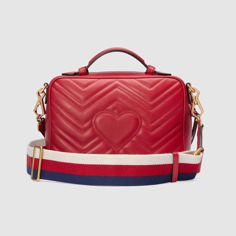The GG Marmont shoulder bag has a softly structured shape with zip around closure and an oversized front flap with Double G hardware. The shoulder strap features the Sylvie Web stripe, an evolution of the Gucci Web in blue, red and white. Made in matelasse chevron leather with a heart on the back.