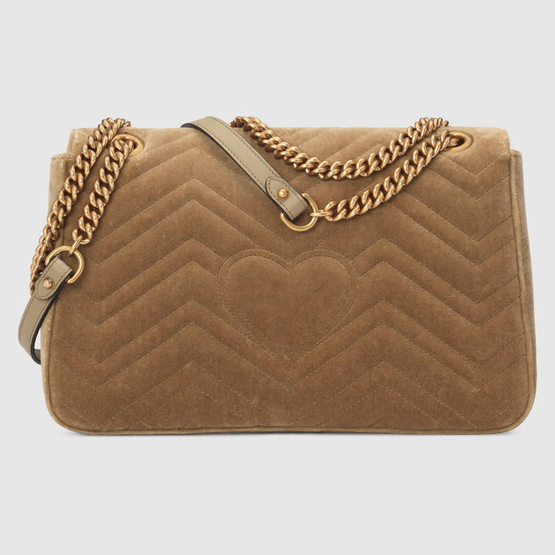 The medium GG Marmont chain shoulder bag has a softly structured shape and an oversized flap closure with Double G hardware. The sliding chain strap can be worn multiple ways, changing between a shoulder and a top handle bag. Made in matelass茅 chevron velvet with a heart on the back.