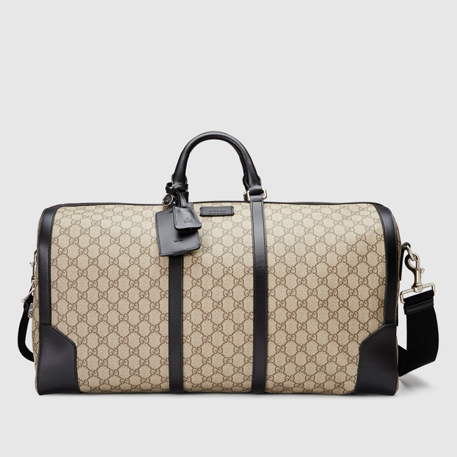 Large duffle in GG Supreme canvas with leather trims and a durable nylon strap.