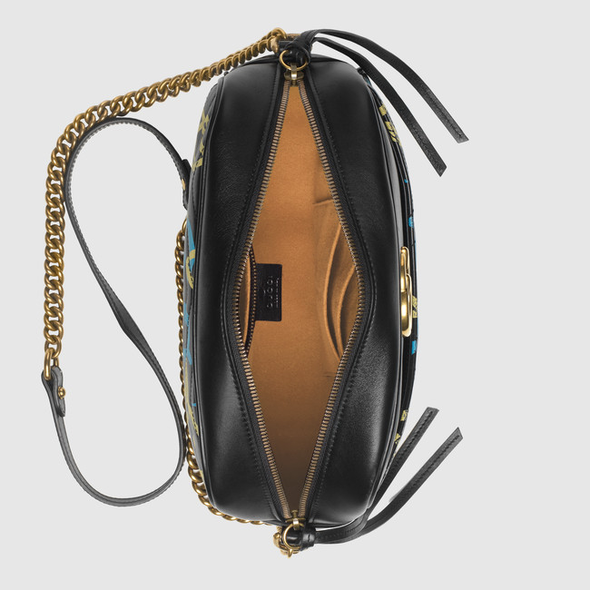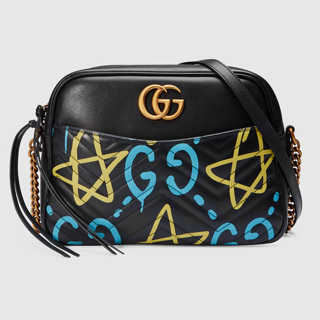 Brooklyn-based artist Trouble Andrew was invited by Alessandro Michele to collaborate on the Fall Winter 2016 Fashion Show collection, by incorporating his art into Alessandro Michele鈥檚 designs. The final product is a mix of two cultures-a juxtaposition of the past and the present. The medium chain shoulder bag was designed by Alessandro and customized by Trouble Andrew. It has a softly structured shape and a zip top closure with Double G hardware. The chain shoulder strap has a leather shoulder detail. Made in GucciGhost print matelasse leather with a chevron design and GG on the back.
