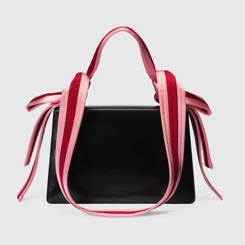 The dragon-thought to be a symbol of power, strength, and good luck-is present throughout the Spring Summer men's and women's collections. Made from enamel-colored brass and complemented by a silk satin tied shoulder strap. Made in a smooth, glossy leather with a firm surface for a structured shape.