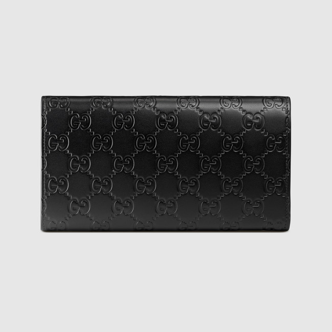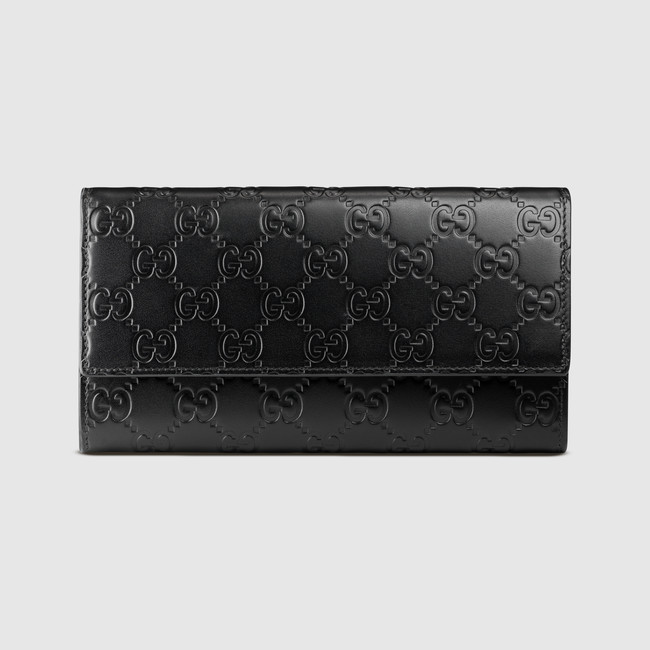 A continental wallet with a flap and snap closure. Made in our heat embossed Gucci Signature leather resulting in a defined print with a firm texture.