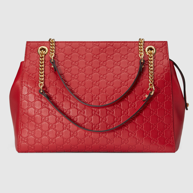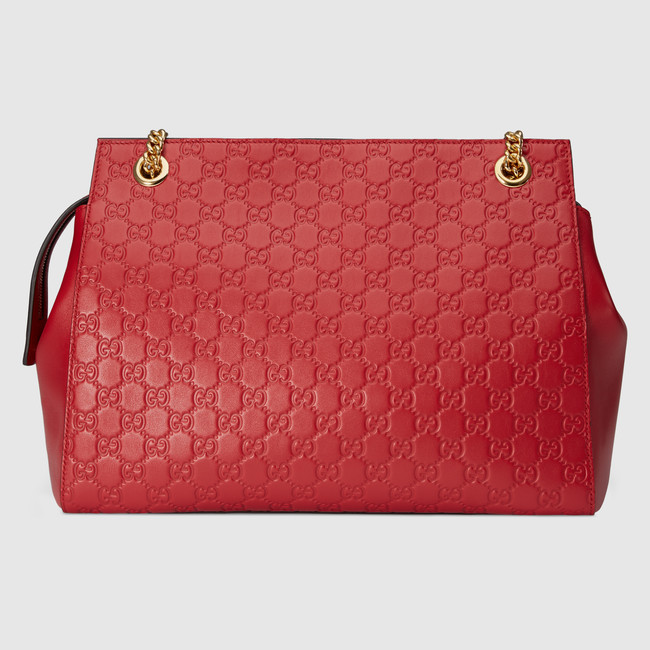 A large shoulder bag with a softly structured shape. The chain straps have a leather shoulder detail. Made in heat debossed soft Gucci Signature leather with a defined print and firm texture-an update to the classic Gucci Signature leather with a softer construction.