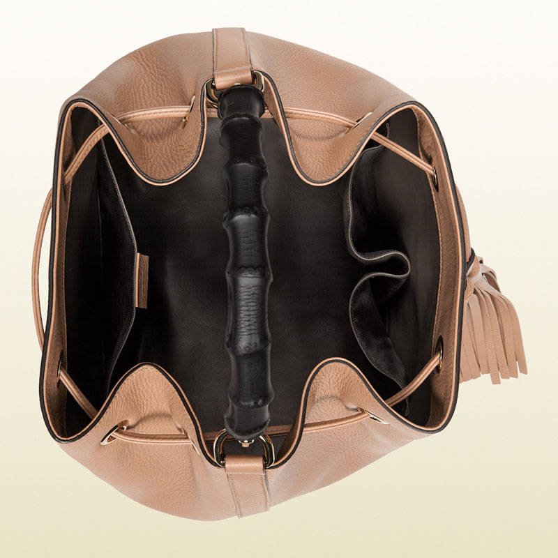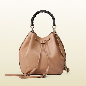 the new heroine of your handbag collection. multi-functional with room to spare, our structured bucket bag boasts a beautiful bamboo handle and a striking chain strap. made in one of signature leathers, noted for its incredible softness, elasticity and light weight.